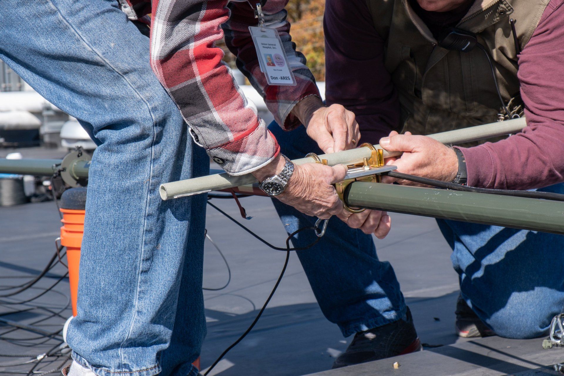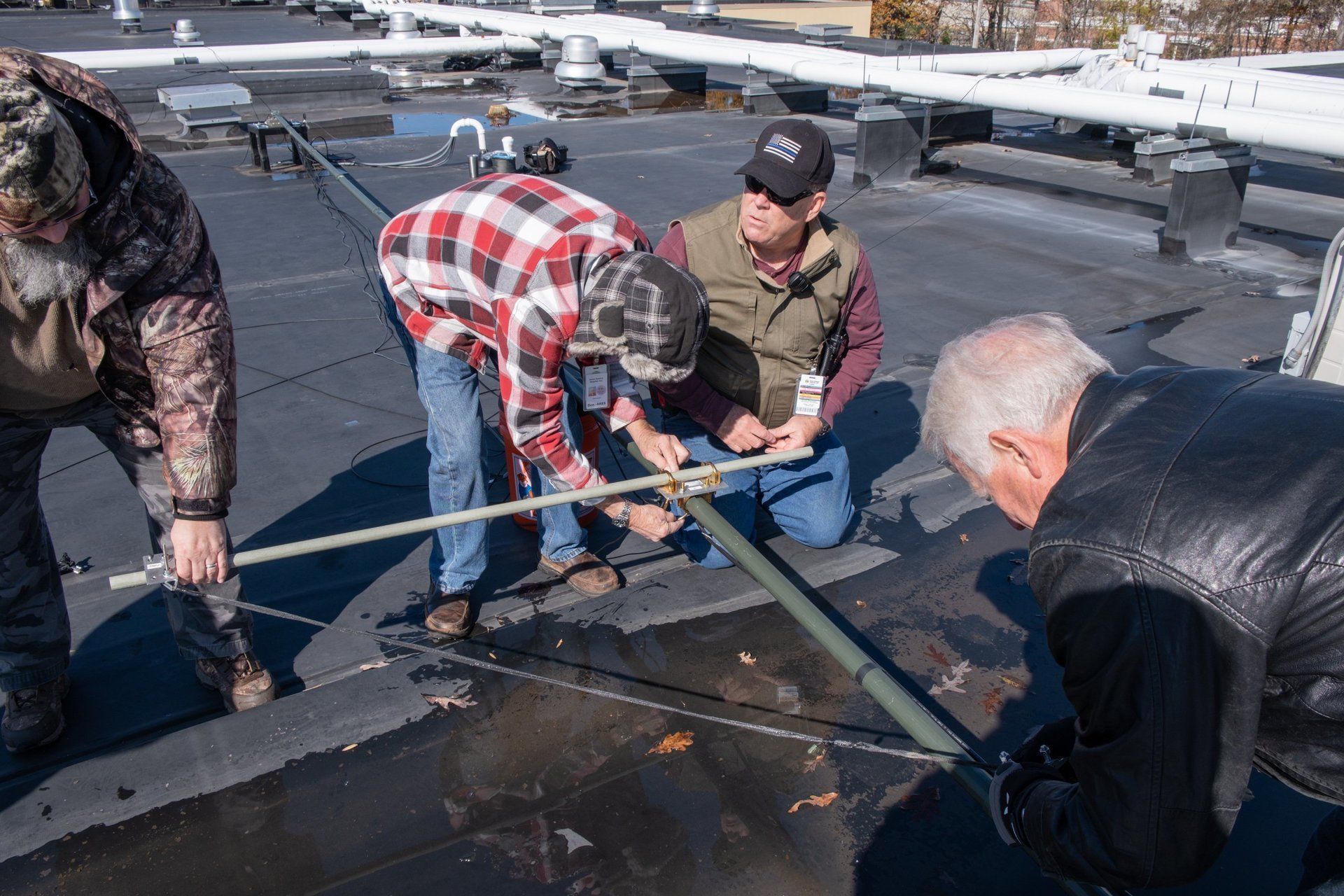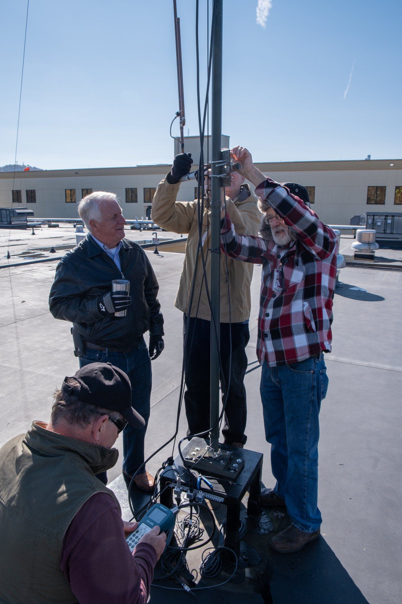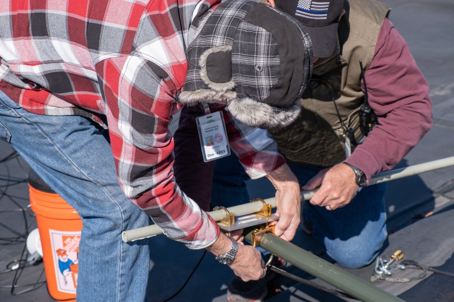 Yes, it was chilly on November 10th, 2018 but the intrepid team of antenna hangers climbed onto the roof of the Hospital and made adjustments to the HF Antenna. After 4-hours it was back in place but still work to do with 80 meters.