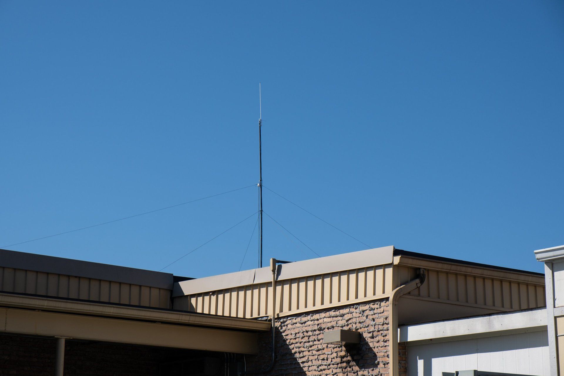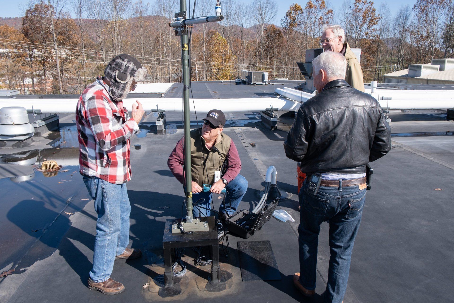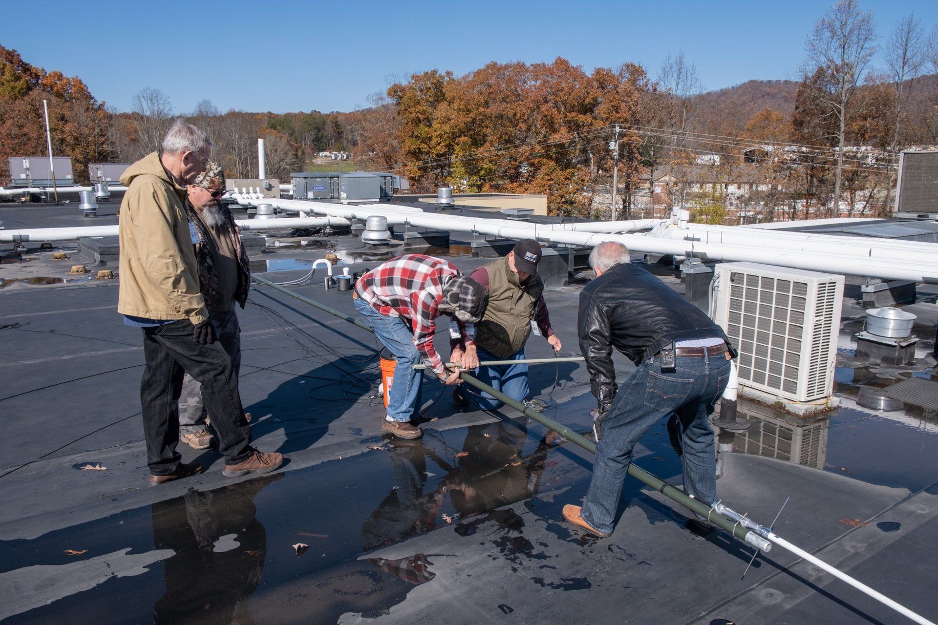 Yes, it was chilly on November 10th, 2018 but the intrepid team of antenna hangers climbed onto the roof of the Hospital and made adjustments to the HF Antenna. After 4-hours it was back in place but still work to do with 80 meters.