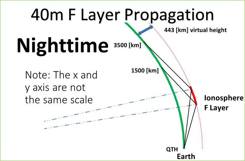 Radiation from the sun causes ionized layers to appear in the ionosphere. During the daytime (direct sunlight) there is a layer called the E-layer. During the nighttime, the E-layer disappears, and we are left with the F-layer. The E-layer is at a much lower altitude and cuts off signals to the F-layer. The F-layer is present day and night, but its strength diminishes during the night. Let’s look at nighttime propagation on 40 meters. For complicated reasons, only a small sliver of the F-layer can reflect 7 MHz radio signals. This means nighttime propagation on 40 meters goes from about 1500 [km] to about 3500 [km], as shown in Figure 6.