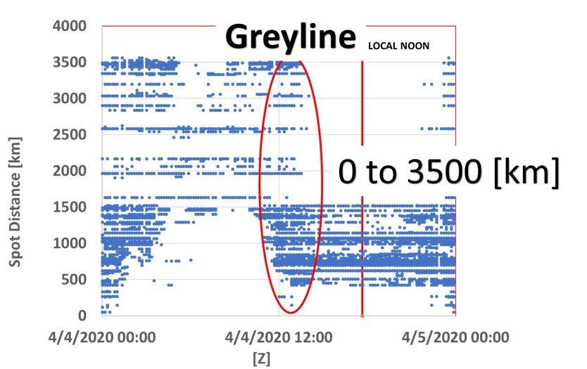 Looking at just the spots, shown in Figure 4, during the daytime (around local noon), the band extends from about 500 [km] to about 1500 [km]. During the night time in Figure 5, the band extends from about 1500 [km] to about 3500 [km]. During the “greyline” (dusk and dawn) the band extends from 0 [km] to 3500 [km]. I’ll explain what I think is happening during these three periods.