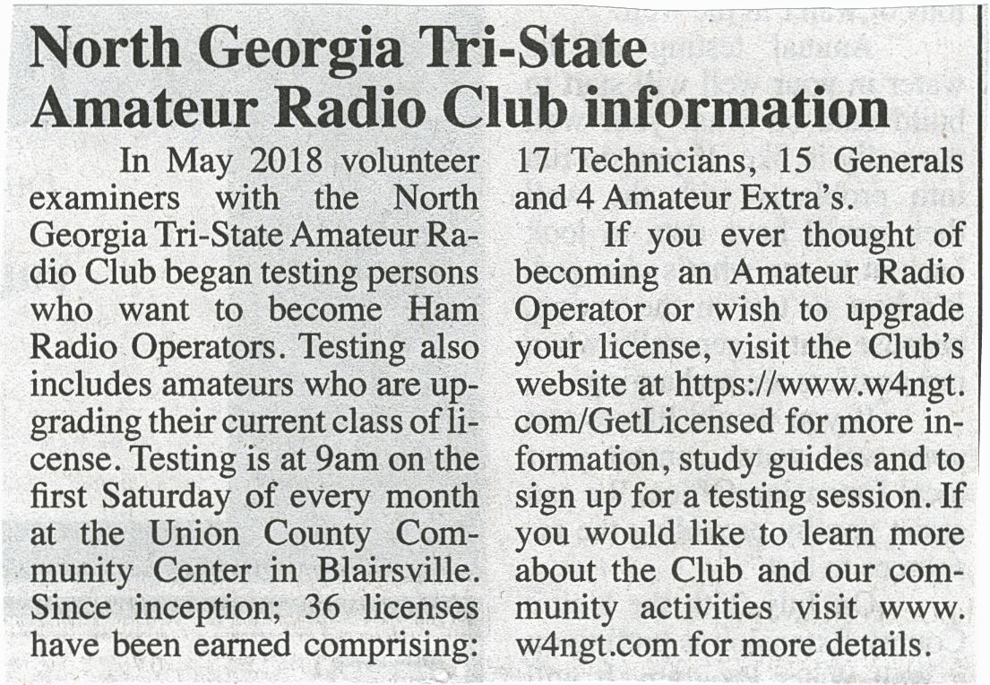 Many thanks to the North Georgia News for the article on our fine Club and it's VE team. Copyright North Georgia News, June 19th, 2019.