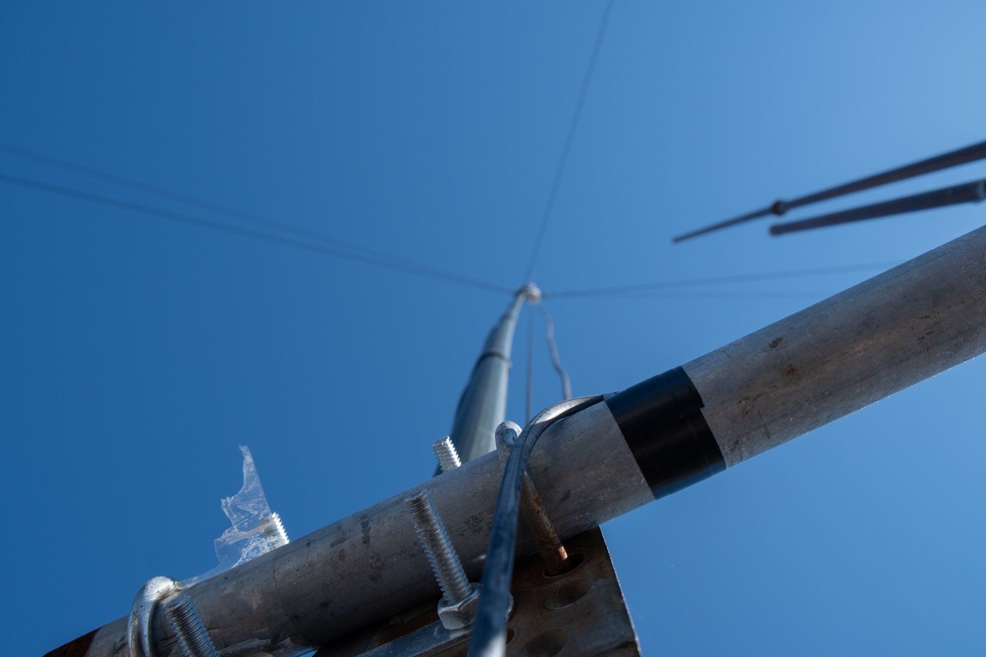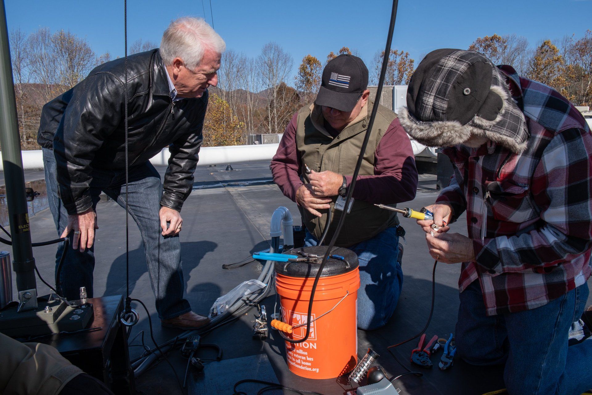 Yes, it was chilly on November 10th, 2018 but the intrepid team of antenna hangers climbed onto the roof of the Hospital and made adjustments to the HF Antenna. After 4-hours it was back in place but still work to do with 80 meters.