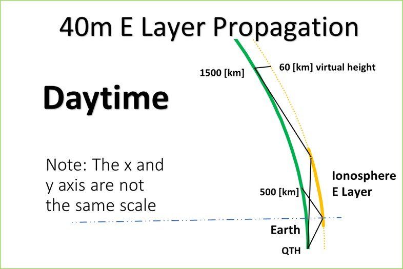 Figure 8 - During the daytime, propagation is due to the E-layer, at an altitude of about 60 [km]. The result is propagation from about 500 [km] to about 1500 [km].