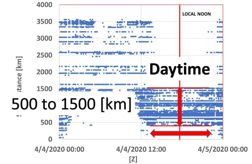 Looking at just the spots, shown in Figure 4, during the daytime (around local noon), the band extends from about 500 [km] to about 1500 [km]. During the night time in Figure 5, the band extends from about 1500 [km] to about 3500 [km]. During the “greyline” (dusk and dawn) the band extends from 0 [km] to 3500 [km]. I’ll explain what I think is happening during these three periods.