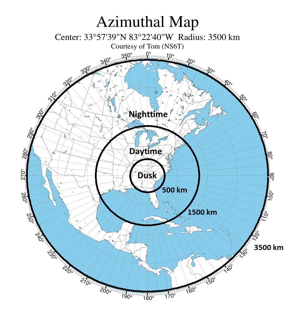 Radiation from the sun causes ionized layers to appear in the ionosphere. During the daytime (direct sunlight) there is a layer called the E-layer. During the nighttime, the E-layer disappears, and we are left with the F-layer. The E-layer is at a much lower altitude and cuts off signals to the F-layer. The F-layer is present day and night, but its strength diminishes during the night. Let’s look at nighttime propagation on 40 meters. For complicated reasons, only a small sliver of the F-layer can reflect 7 MHz radio signals. This means nighttime propagation on 40 meters goes from about 1500 [km] to about 3500 [km], as shown in Figure 6.