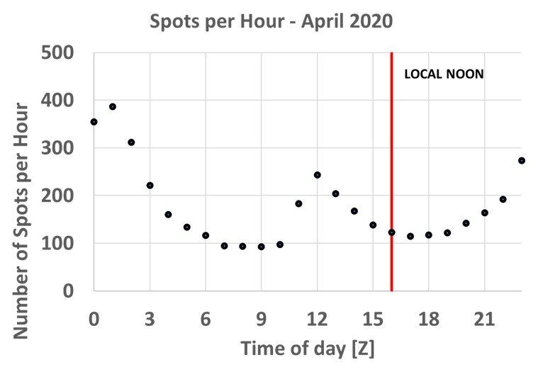 Figure 12 - The number of spots per hour changes throughout the day by a factor of four. If you were operating at 0100 Z you'd think the bands were hopping, at 1700 Z not so much.